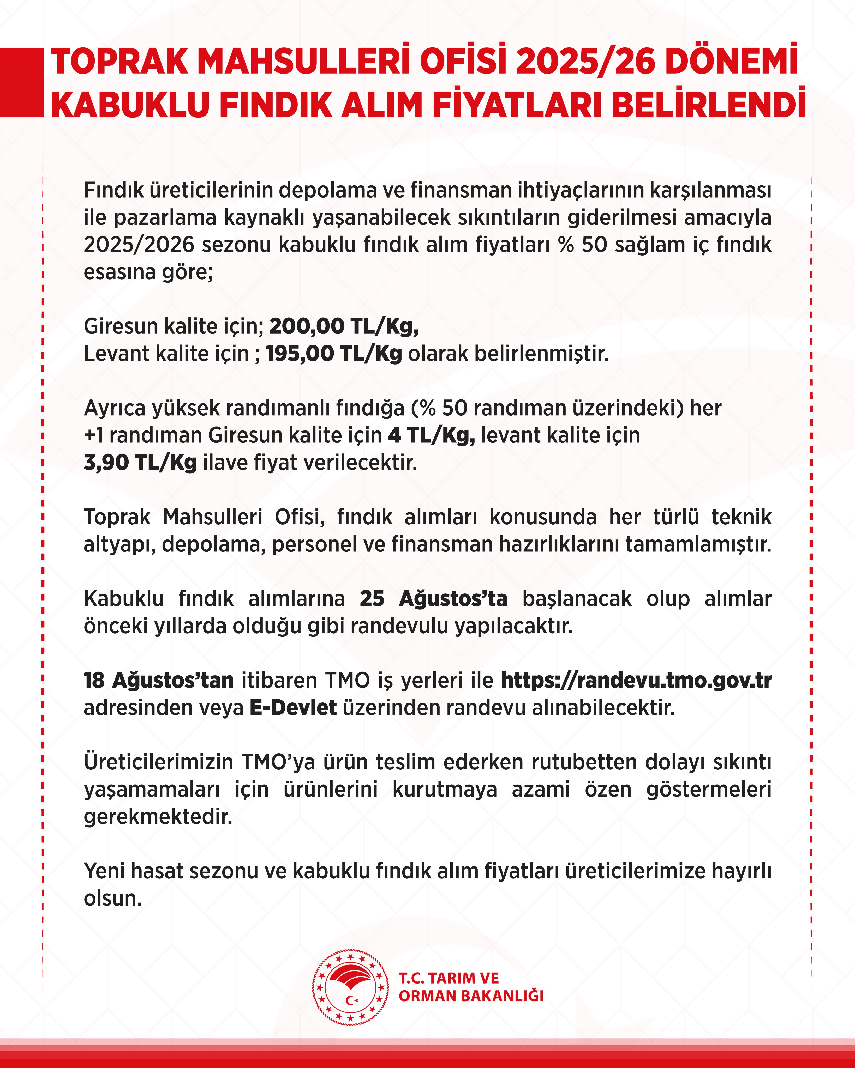 Tarım ve Orman Bakanlığı'nın ilgili kuruluşu olan Toprak Mahsulleri Ofisi (TMO), 2025-2026 sezonu kabuklu fındık alım fiyatlarını kilogram başına Giresun kalite için 200 lira, levant kalite için 195 lira olarak belirledi.