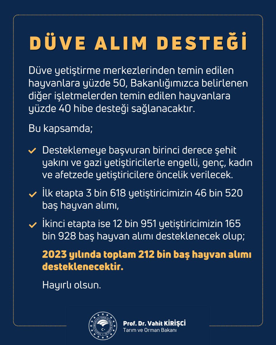 Desteklemeye başvuran birinci derece şehit yakını ve gazi yetiştiricilerle engelli, genç, kadın ve afetzede yetiştiricilere öncelik verilecek. İlk etapta 3 bin 618 yetiştiricimizin 46 bin 520 baş hayvan alımı, ikinci etapta ise 12 bin 951 yetiştiricimizin 165 bin 928 baş hayvan alımı desteklenecek olup; 2023 yılında toplam 212 bin baş hayvan alımı desteklenecek.