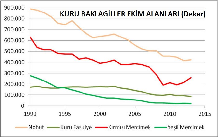 Şimdilerde 7,4 milyon dekar alandan toplam 1 milyon 35 bin ton bakliyat üretimi ile nohut, fasulye, barbunya ile yeşil ve kırmızı mercimekte ithalata bağımlı hale geldik. Daha özet bir ifade ile baklagiller ekilen alanda yüzde 63, üretim miktarında ise yüzde 49 geriledik.