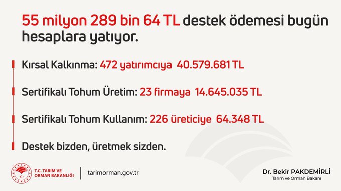 Çiftçilere 55 milyon 289 bin 64 TL destek ödemesinin bugün hesaplara yattığını açıklayan Tarım ve Orman Bakanı Bekir Pakdemirli, paylaşımında, "Çiftçilerimize hayırlı, uğurlu ve bereketli olsun. Destek bizden, üretmek sizden" ifadelerine yer verdi.