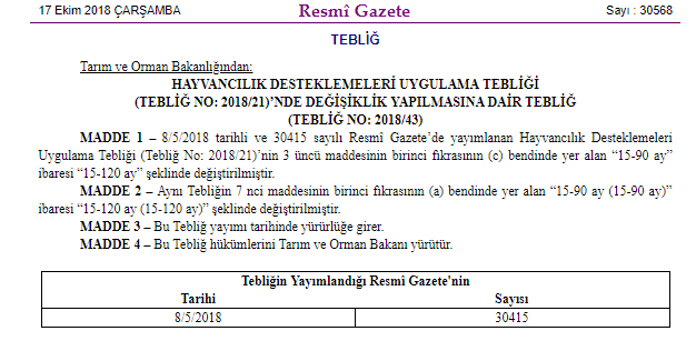 Tarım ve Orman Bakanlığının, Hayvancılık Desteklemeleri Uygulama Tebliği (Tebliğ No: 2018/21)'nde Değişiklik Yapılmasına Dair Tebliği (No: 2018/43), Resmi Gazete'de yayımlandı.