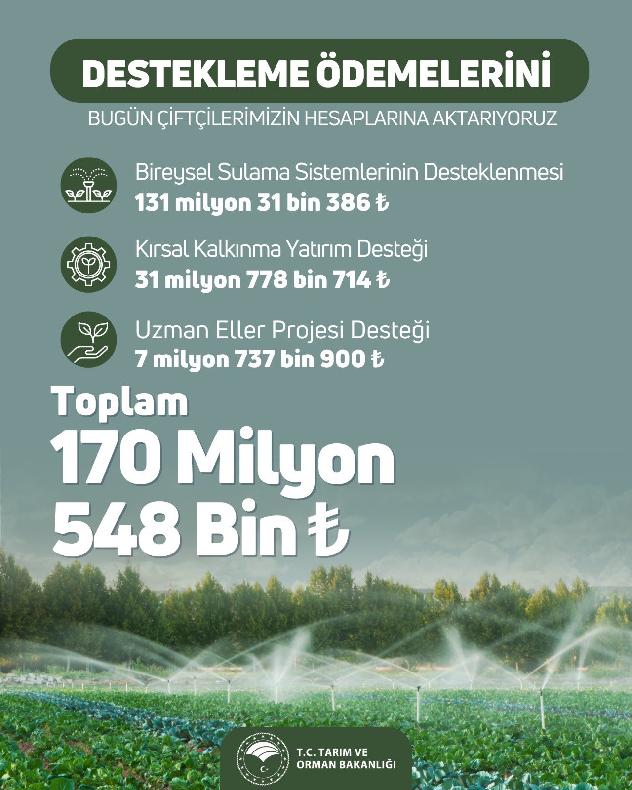 olmak üzere toplam 170 milyon 548 bin liralık tarımsal destek ödemesi bugün çiftçilerimizin hesaplarına aktarılacak.