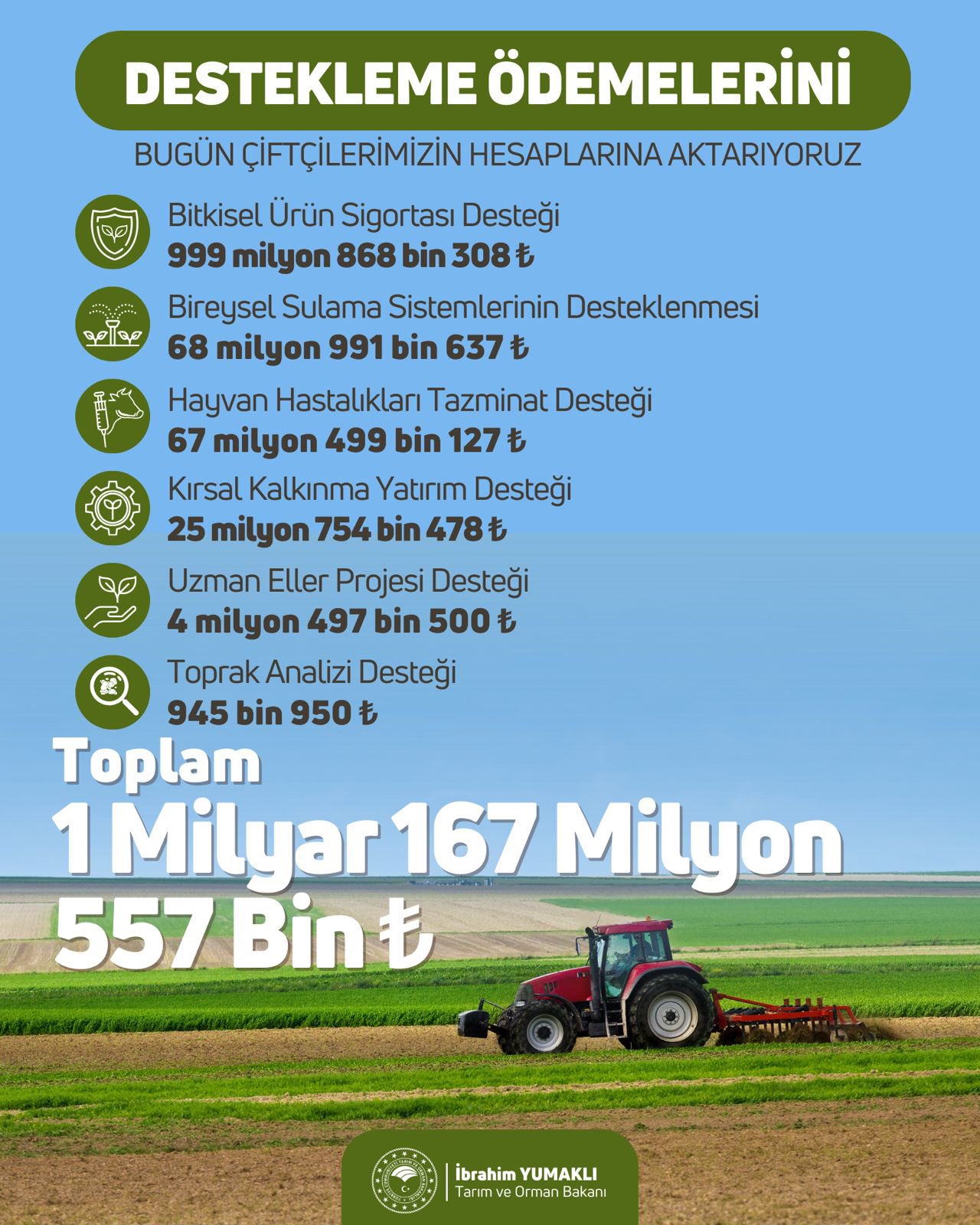 olmak üzere toplam 1 milyar 167 milyon 557 bin liralık tarımsal destek ödemesi bugün çiftçilerimizin hesaplarına aktarılacak.
