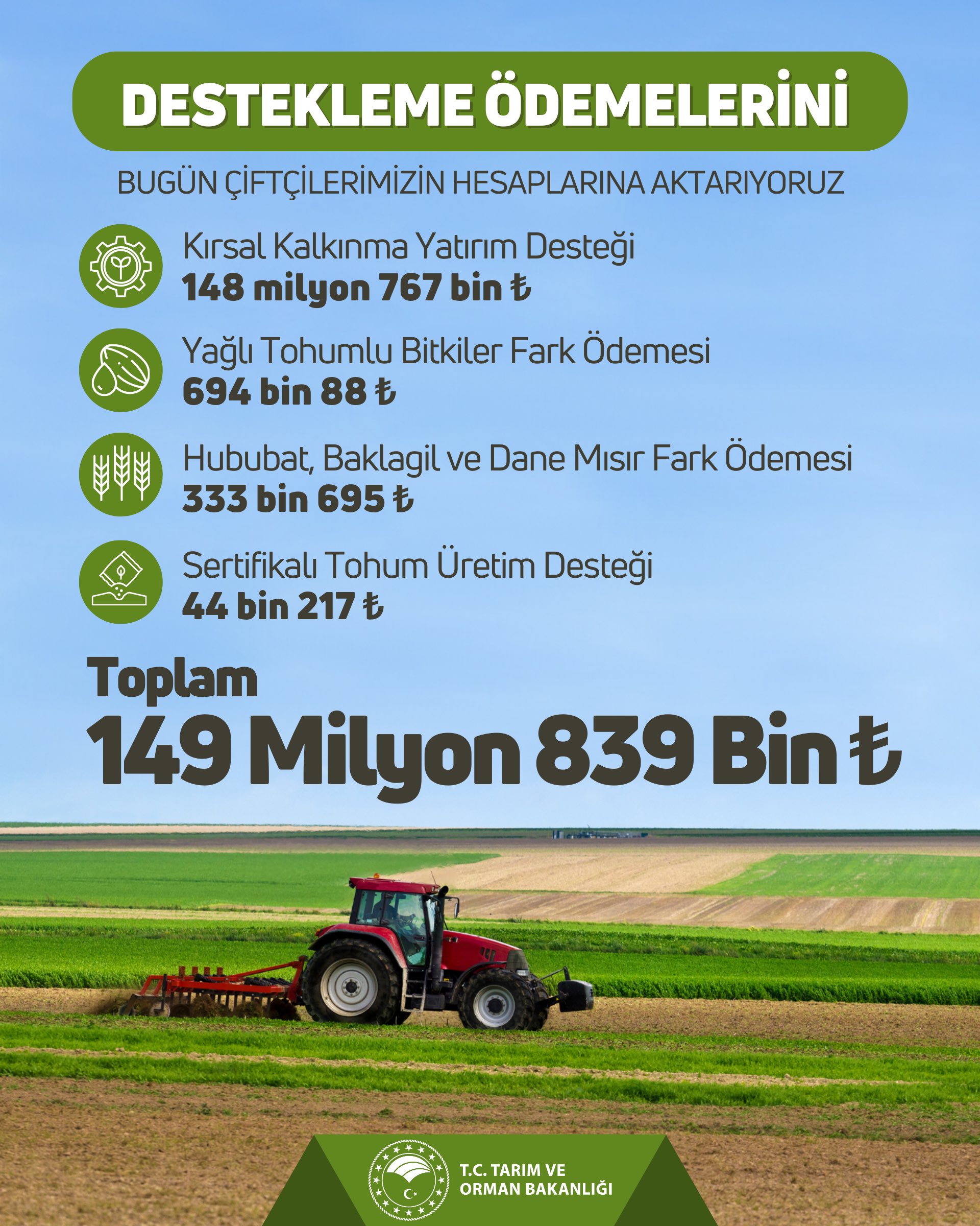 Tarım ve Orman Bakanlığı tarafından sağlanan tarımsal destek ödemeleri kapsamında bugün toplamda 149 milyon 839 bin TL çiftçilerimizin hesaplarına aktarılıyor.