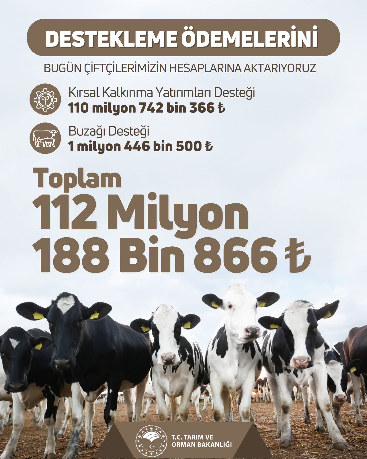 Toplamda 112 milyon 188 bin 866 TL ödeme çiftçilerimizin hesaplarına aktarıldı.