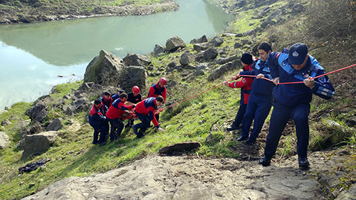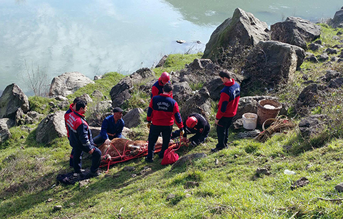Kayalıklara çarparak, duran dananın sahibi Orhan Duru, kendi imkanlarıyla hayvanı kurtaramayınca, durumu itfaiyeye haber verdi. Ereğli Belediyesi'ne bağlı itfaiye ekipleri, kayalıkların arasından çıkardığı danayı yürütemeyince, yanlarında getirdikleri sedyeye koydu.