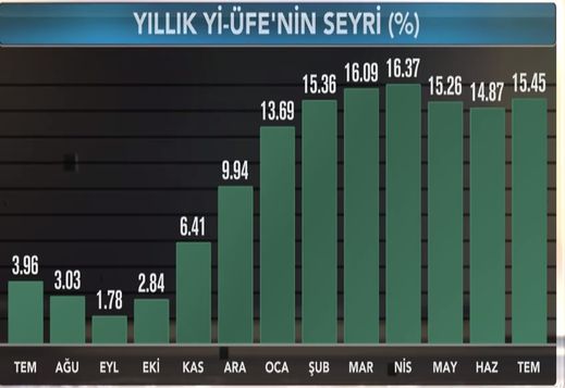 Yİ-ÜFE, temmuzda bir önceki aya göre yüzde 0,72, geçen yılın aralık ayına göre yüzde 8,60, geçen yılın aynı ayına göre yüzde 15,45 ve 12 aylık ortalamalara göre yüzde 10,94 arttı.