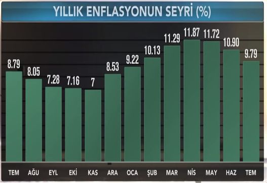 TÜFE, temmuzda geçen yılın aralık ayına göre yüzde 6,05, geçen yılın aynı ayına göre yüzde 9,79 yükseldi. Beklenti TÜFE'de aylık %0.17, yıllık % 9.90 artış olmasıydı. Çekirdek TÜFE %9.20'den %9.60'ya yükseldi.