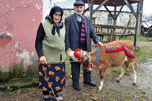 TRABZON'un Tonya ilçesinde oturan Ahmet Baki (85) 14 Şubat Sevgililer Günü'nde, 10 çocuk annesi eşi Raziye Baki'ye (78) süslediği buzağıyı hediye etti.