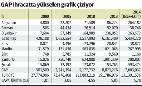 Güneydoğu Anadolu Projesi (GAP) son dönem eylem planı çerçevesinde, üretime yönelik eylemlerle birlikte bölgeden yapılan ihracatta büyük artış meydana geldi. 2000 yılında Türkiye ihracatının yüzde 1.81’i bölgeden yapılırken, bu oran 2010’da eylem planını başladığı dönemde yüzde 4.55’e yükseldi. 2013 sonunda ise yüzde 5.85 olarak ölçüldü. Ancak bölgedeki ihracatın büyük kısmının, son 20 yılda çok hızlı bir büyüme gerçekleştiren Gaziantep’ten yapılması dikkat çekti. Gaziantep dışarıda bırakıldığında, diğer illerin Türkiye ihracatından aldığı pay 2013 sonu itibariyle yüzde 1.8’e geriliyor. Aynı oran 2010’da 1.5 seviyesindeydi.