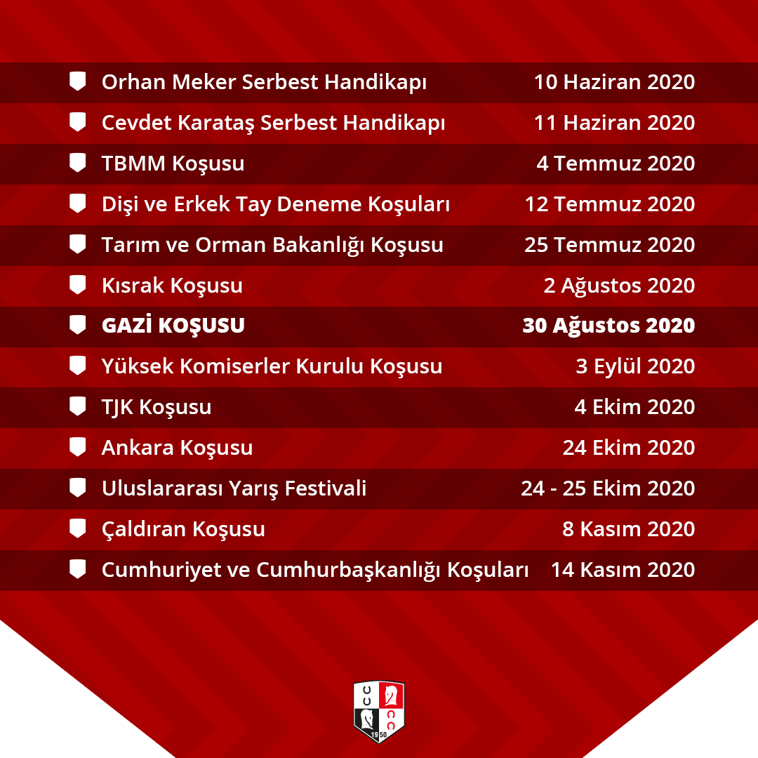 TJK'nın belirlediği programa göre, TBMM Koşusu 4 Temmuz'da, Tarım ve Orman Bakanlığı Koşusu 25 Temmuz'da, Uluslararası Yarış Festivali 24 ve 25 Ekim'de, Cumhuriyet ve Cumhurbaşkanlığı Koşuları ise 14 Kasım tarihlerinde gerçekleştirilecek.