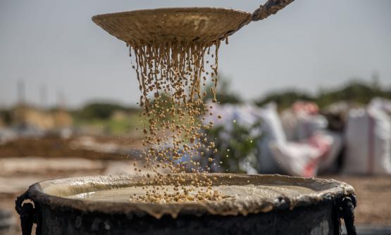 Çuvallara doldurulduktan sonra taş havuzlarda yöreye has beyaz toprakla birlikte ezilerek çıkarılan üzüm şırası, büyük bakır kazanlarda ve odun ateşinde saatlerce kaynatılarak pekmeze dönüştürülüyor.