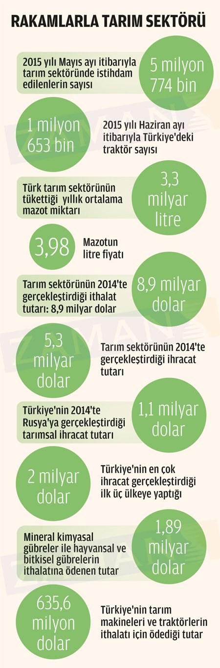 Türkiye, geçen yıl ithal edilen tohumlara 143 milyon dolar ödedi. Geçtiğimiz yıl gübre ithalatına ödenen tutar ise 700 milyon doların üzerinde. 2008 yılında 1 milyon 359 bin traktörün olduğu Türkiye'de şu anda 1 milyon 627 bin traktör bulunuyor. Traktör sayısındaki bu artışın 2008'de 3,22 milyar litre olan tarımsal mazot tüketimini de yarım milyar litrenin üzerinde artırdığı tahmin ediliyor. Mazot, gübre ve tohum, tarım sektörünün en önemli ithal girdi kalemleri. Ancak liste bununla sınırlı değil. Bu rakamlara çiftçinin belini büken diğer kalemleri de ekleyince tablo içinden çıkılmaz bir hal alıyor. Türkiye Odalar ve Borsalar Birliği'ne göre tarım sektörünün toplam ithalat tutarı, 2014'te 8,9 milyar dolar. İhracat ise bunun neredeyse yarısı: 5,3 milyar dolar.