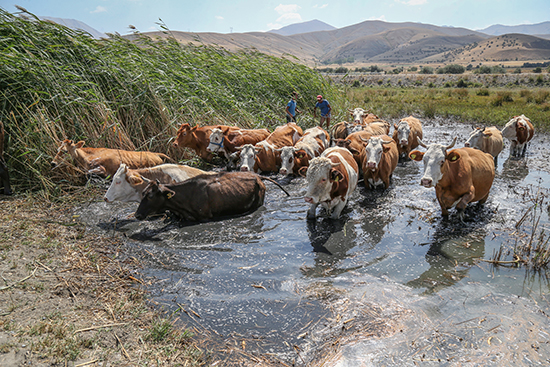 Çocuklar, Akdamar Adası'nın karşı kıyılarında gün boyu otlattıkları hayvanlarını, sıcaklığın iyice bastırmasıyla göle sokuyor.