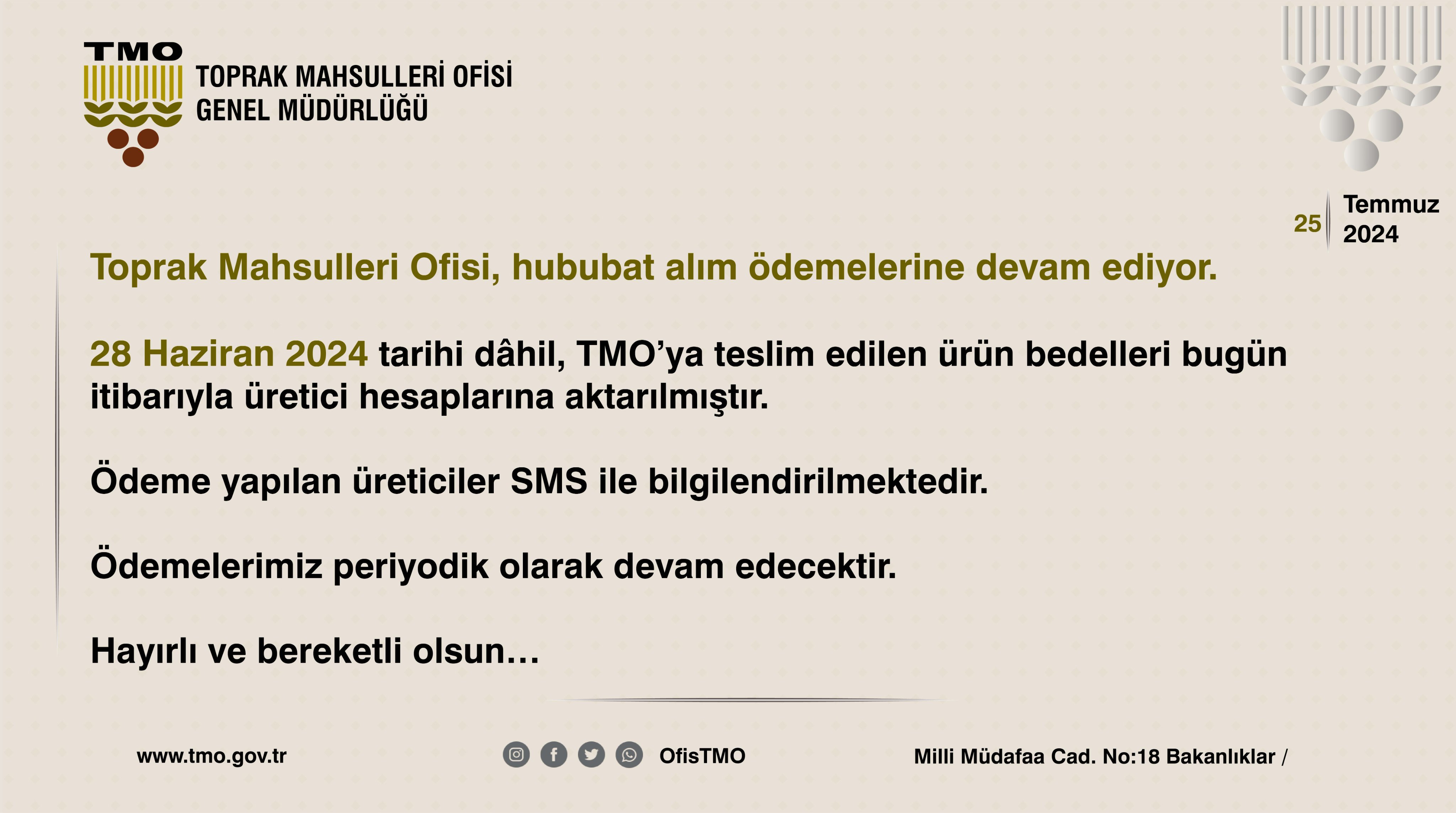 28 Haziran 2024 tarihi de dahil olmak üzere, TMO'ya teslim edilen ürün bedelleri üreticilerin hesaplarına aktarılmış durumda.