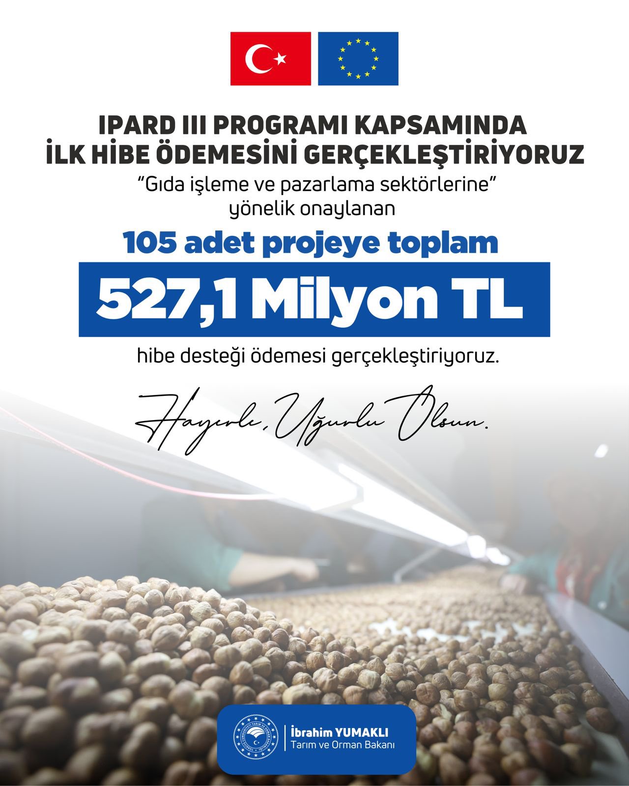 Tarım ve Orman Bakanı İbrahim Yumaklı, IPARD III kapsamında gıda işleme ve pazarlama sektörlerine yönelik 105 proje için 527,1 milyon lira hibe ödemesi yapıldığını duyurdu.