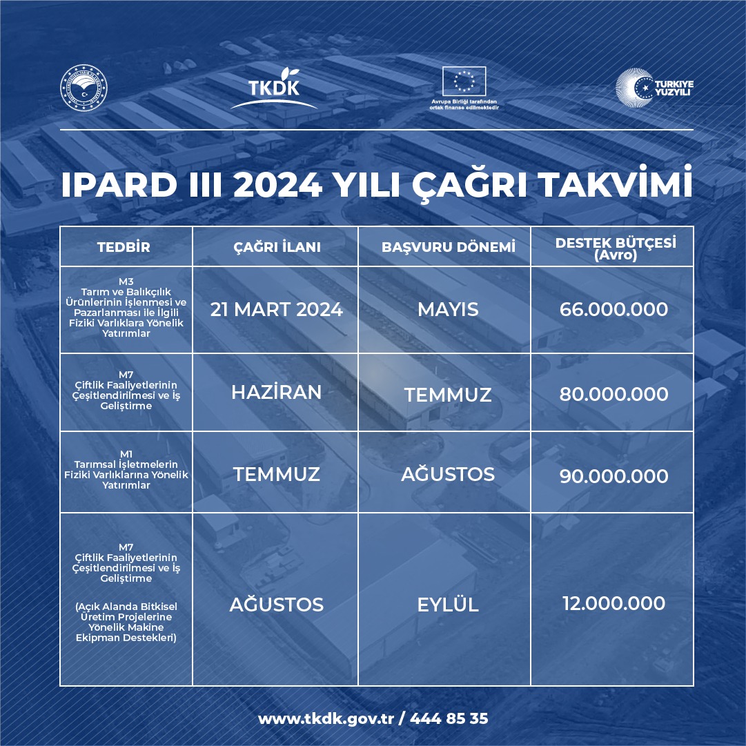 Tarım ve Orman Bakanlığı'nın ilgili kuruluşu olan Tarım ve Kırsal Kalkınmayı Destekleme Kurumu (TKDK), 2024 yılında yapılacak çağrılarla ilgili takvimi açıkladı. Bakan İbrahim Yumaklı, IPARD III Programı'nın 81 ile yaygınlaştırıldığını ve 7 yıl içinde 785 milyon avro hibe desteği sağlanacağını duyurdu.