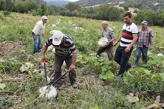Bilecik merkeze bağlı Kızıldamlar köyünde organik üretilen, lezzeti ve dayanıklılığı dolayısıyla tarlada satılan kestane kabağının hasadı için sabahın erken saatlerinde tarlaya giden üreticiler, her biri 15-20 kilogram ağırlığında olan ürünlerini kesiyor.