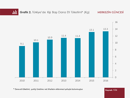 Türkiye'de büyükbaş hayvan yetiştiriciliği ve besiciliğindeki yem maliyetinin analizine geçmeden önce dana eti tüketiminin gelişimine kısaca bakmakta fayda var. Ülkemizde kişi başına düşen dana eti tüketiminin hızlı bir şekilde arttığını görüyoruz (Grafik 2).