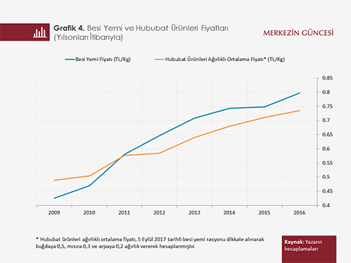 5 Eylül 2017 tarihli besi yemi rasyonuna göre, besi yeminin toplam hammadde maliyeti içinde yurt içinde üretilen hububat ve hububat yan ürünlerinin payı yüzde 67 iken, ithal girdilerin payı yüzde 30. İthal girdilerin Türk Lirası cinsinden fiyatlarının 2009-2016 yılları arasında kur etkisi sebebiyle yüksek oranda arttığını biliyoruz. Söz konusu etki de hesaba katıldığında ilgili dönemde besi yemi fiyatı ile hububat ürünleri ağırlıklı ortalama fiyatının aynı doğrultuda geliştiklerini gözlemlemek mümkün (Grafik 4).
