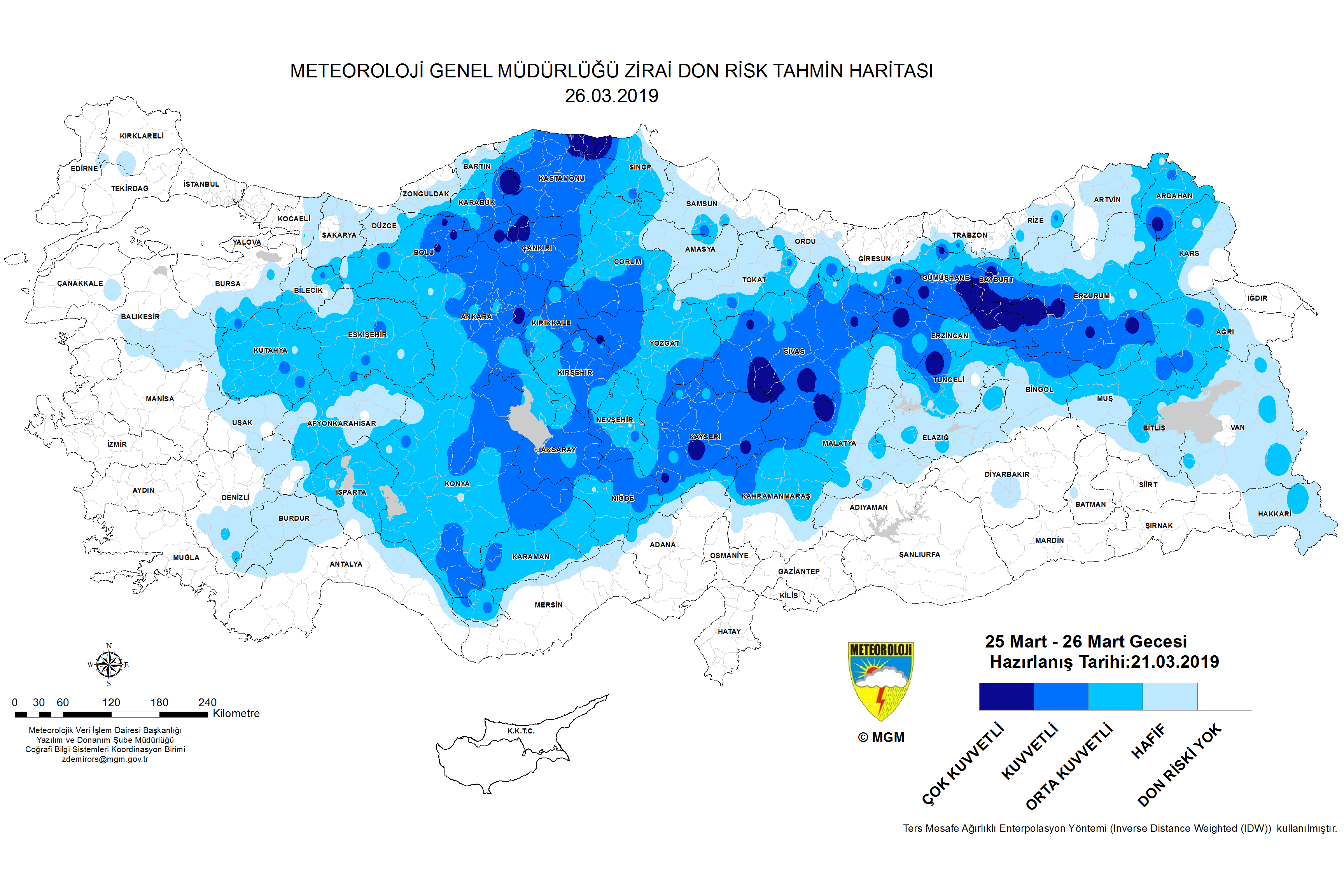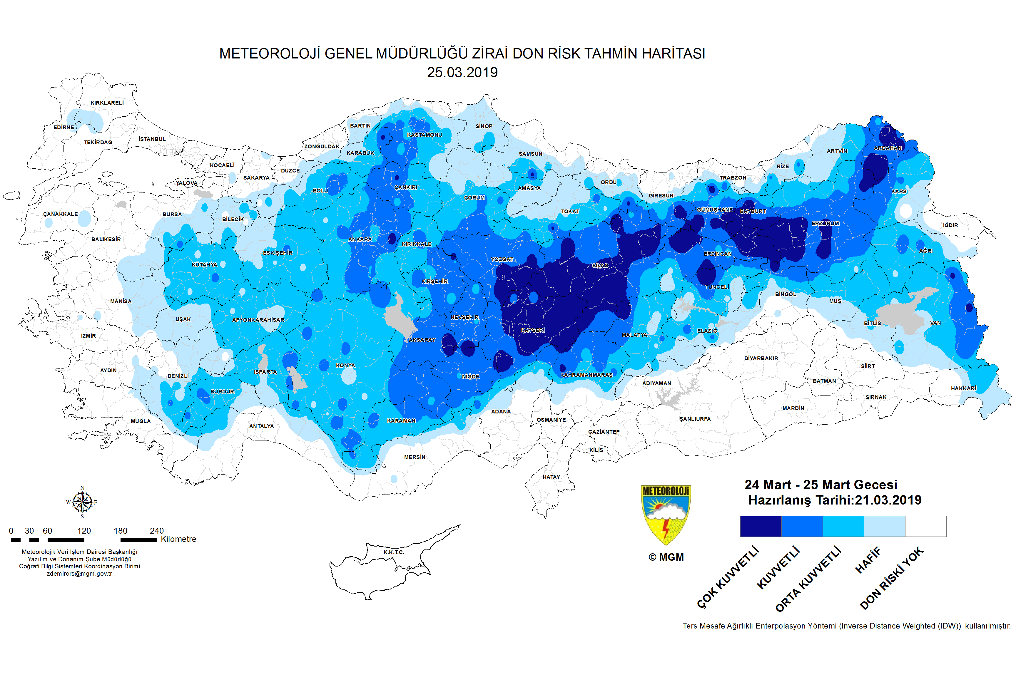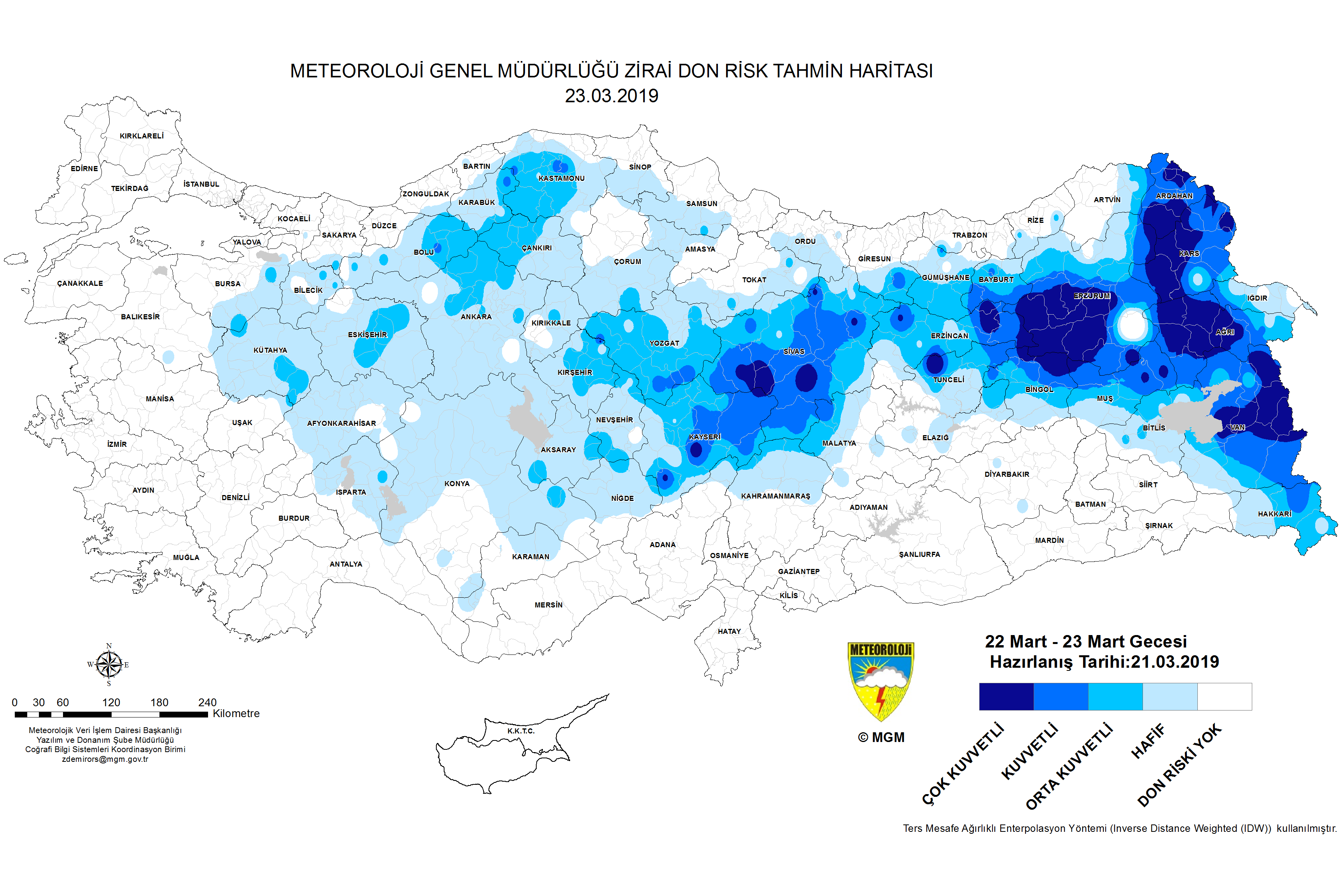 23 Mart Cumartesi gecesinden 26 Mart Salı sabahına kadar, tarımsal faaliyetin olduğu bölgelerimizden Marmara'nın güneydoğusunda hafif, İç Ege, Göller Yöresi, İç Anadolu, Karadeniz'in iç kesimleri ile Doğu Anadolu Bölgesinde orta kuvvette, yüksek rakımlı bölgelerde ise kuvvetli zirai don riski bulunmaktadır. Çiçeklenme dönemindeki badem, kayısı, erik vb. meyve, sebze ve fide yetiştiricileri ile serada üretim yapan çiftçilerimizin gerekli tedbirleri almaları, yörelerindeki don durumu hakkında daha detaylı bilgi almak için en yakın meteoroloji müdürlüklerine başvurmaları önerilir.