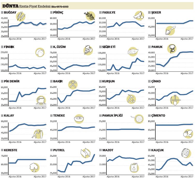 2016 -2017 Ağustos döneminde fiyat artışında ikinci sırada yüzde 39.3 ile çinko, üçüncü sırada ise yüzde 36.8 artışla kauçuk yer aldı. Endeks kapsamına giren diğer ürünlerde ise; pikdemirde yüzde 36.1, kurşunda yüzde 34.2, bakırda yüzde 31.3, putrelde yüzde 29.5, pirinçte yüzde 27.9, kalayda yüzde 26.6, mazotta yüzde 20 .8, sığır etinde yüzde 13.4, kuru üzümde yüzde 11.5, buğdayda yüzde 10.5, tenekede yüzde 10.2, kerestede yüzde 8.7, kuru fasulyede yüzde 7.1, şekerde yüzde 5.7, çimentoda yüzde 4.3, pamuk ipliğinde binde 2 fiyat artışı gerçekleşti. Son bir yılda fındık fiyatı ise yüzde 9.8 geriledi.