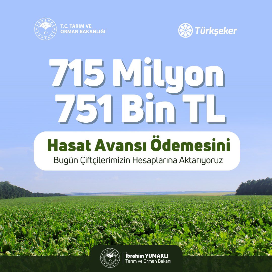 26 Eki '23 Tarım ve Orman Bakanı İbrahim Yumaklı, Türkşeker aracılığıyla 715 milyon 751 bin TL hasat avans ödemesinin pancar üreticilerimizin hesaplarına aktarıldığını açıkladı. Hibe ve Destekler 16 defa okundu Sosyal Medyada Paylaş Önceki Haber Tarımsal Destek Ödemeleri Başladı! 20.10.2023 15:58 Sonraki Haber Trakya`da Ayçiçeği Tarımına Destek! 26.10.2023 16:39