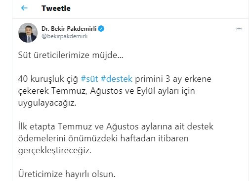 Tarım ve orman Bakanı Bekir Pakdemirli "40 kuruşluk çiğ süt destek primi ödemelerini 3 ay erkene çekerek Temmuz, Ağustos ve Eylül ayları içinde gerçekleştireceğiz" dedi.