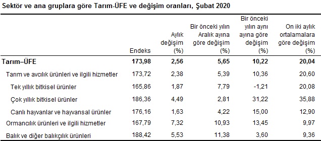 Tarım-ÜFE'de (2015=100), 2020 yılı Şubat ayında bir önceki aya göre %2,56, bir önceki yılın Aralık ayına göre %5,65, bir önceki yılın aynı ayına göre %10,22 ve on iki aylık ortalamalara göre %20,04 artış gerçekleşti.