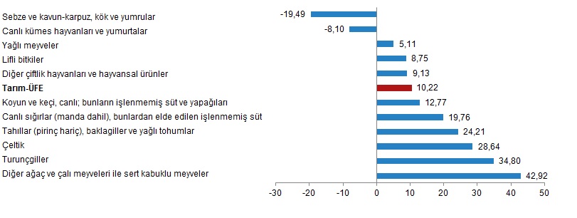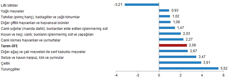 Sektörlerde bir önceki aya göre değişim; tarım ve avcılık ürünleri ve ilgili hizmetlerde %2,38, balık ve diğer balıkçılık ürünlerinde %5,53 ve ormancılık ürünleri ve ilgili hizmetlerde %7,32 artış gerçekleşti. Ana gruplarda bir önceki aya göre değişim; canlı hayvanlar ve hayvansal ürünlerde %1,63, tek yıllık bitkisel ürünlerde %1,87 ve çok yıllık bitkisel ürünlerde %4,49 artış gerçekleşti.