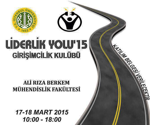 İstanbul Üniversitesi Teknoloji Transfer Merkezi ve İstanbul Üniversitesi Rektörlüğü desteğiyle kurulan Mühendislik Fakültesi Girişimcilik Kulübü tarafından düzenlenen "Liderlik Yolu'15" etkinliği 17-18 Mart tarihlerinde, önemli isimleri bir araya getiriyor.