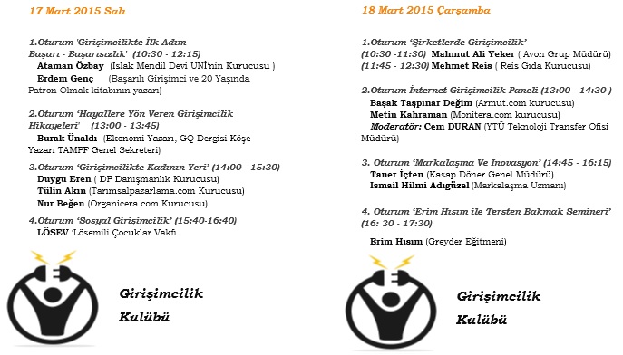 Bu yıl 2. kez düzenlenen etkinliğe başarılı girişimciler ve girişimci adayları katılıyor. Etkinlik İstanbul Üniversitesi Mühendislik Fakültesi/Avcılar’da gerçekleşiyor.Girişimciliğe İlk Adım Başarı ve Başarısızlık, Hayallere Yön Veren Girişimcilik Hikayeleri, Girişimcilikte Kadının Yeri ve Sosyal Girişimcilik “Sosyal Yardım Kuruluşları” adlı oturumlarla 17 Mart Salı günü ilk gerçekleştirilecek etkinliğin, ikinci gün başlıkları ise, Kurumsal Girişimcilik, İnternet Girişimcilik Paneli, Markalaşma ve İnovasyon, Erim Hısım ile Tersten Bakmak semineri şeklinde.