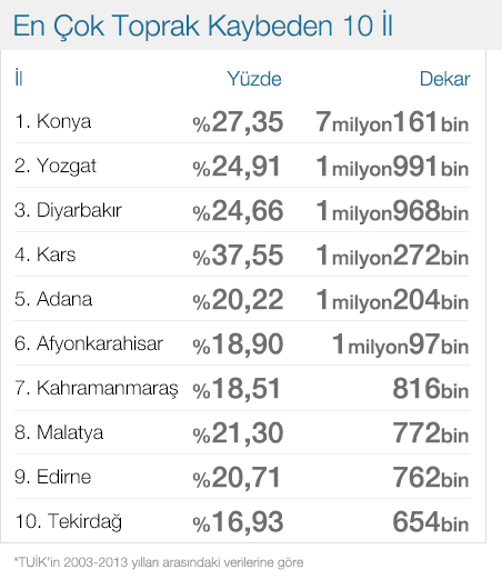 Adana, Türkiye İstatistik Kurumu'nun (TÜİK) verilerine göre 2003-2013 yılları arasında tarım arazilerinin 1 milyon 204 bin dekarını kaybetti. Artan nüfus ve göç, kent merkezine yakın tarım arazilerini inşaat sektörü için hazine değerinde arsalara dönüştürüyor. 2005 yılında yapılan yasal düzenlemelere rağmen, uzmanlar tarım arazilerinin korunması için daha katı önlemler alınması gerektiğini belirtiyor.