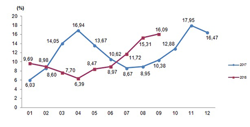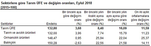 Tarım ürünleri üretici fiyat endeksi (Tarım-ÜFE), 2018 yılı Eylül ayında bir önceki aya göre yüzde 3,68, bir önceki yılın Aralık ayına göre yüzde 8,48, bir önceki yılın aynı ayına göre yüzde16,09 ve on iki aylık ortalamalara göre yüzde 11,59 artış gösterdi.