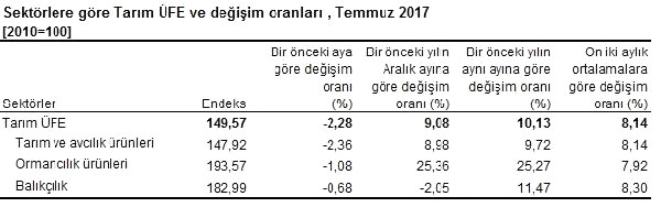 Türkiye İstatstik Kurumu'nun ( TÜİK) verilerine göre, tarım ürünleri üretici fiyatları yılın ilk yedi ayında yüzde 9.08, yıllık bazda yüzde 10.13 ve on iki aylık ortalamalara göre ise yüzde 8.14 arttı.
