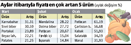 Yılbaşından bu yana açıklanan üç enflasyon bülteninde de fiyatı en çok artan ilk 5 maddeyi tarım ürünleri oluşturdu. Ocakta patlıcanda yüzde 61.19 gibi oldukça yüksek oranlı artış dikkati çekti. Ancak düşük gelirli ailelerin en çok tükettiği ürünlerden birisi olan patates fiyatlarındaki aşırı yükseliş de gözden kaçmadı. Uzun süre kilosu 4-5 liradan satılan patates fiyatları bir miktar durulsa da halen 4 lira bandında seyrediyor.
