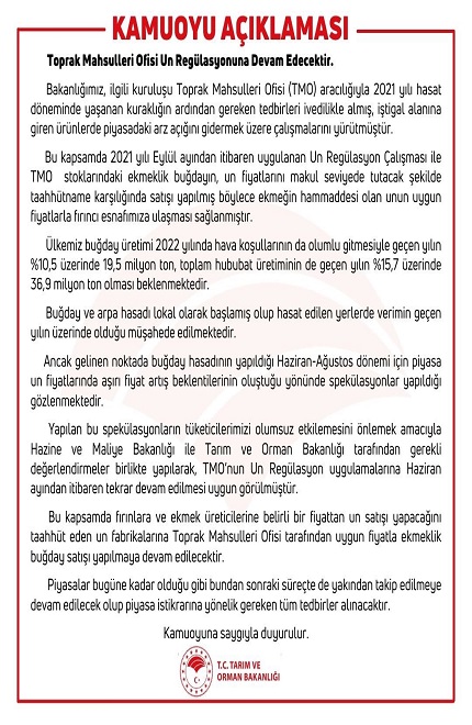 Bu kapsamda Tarım ve Orman Bakanlığı un fiyatlarındaki olası spekülatif fiyat hareketlerinin önüne geçmek için Toprak Mahsülleri Ofisi (TMO) aracılığı ile 2021 Eylül ayından buyana uyguladığı Un Regülasyon Çalışması'na devam kararı aldı.