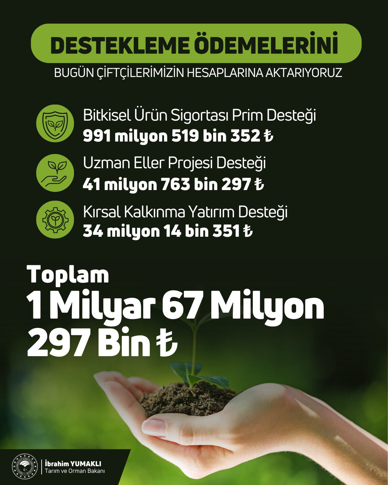 Bugün, toplamda 1 milyar 67 milyon 297 bin TL'lik destek ödemesi, çiftçilerimizin hesaplarına aktarıldı. Bu destek, çeşitli kategorilerde dağıtıldı: