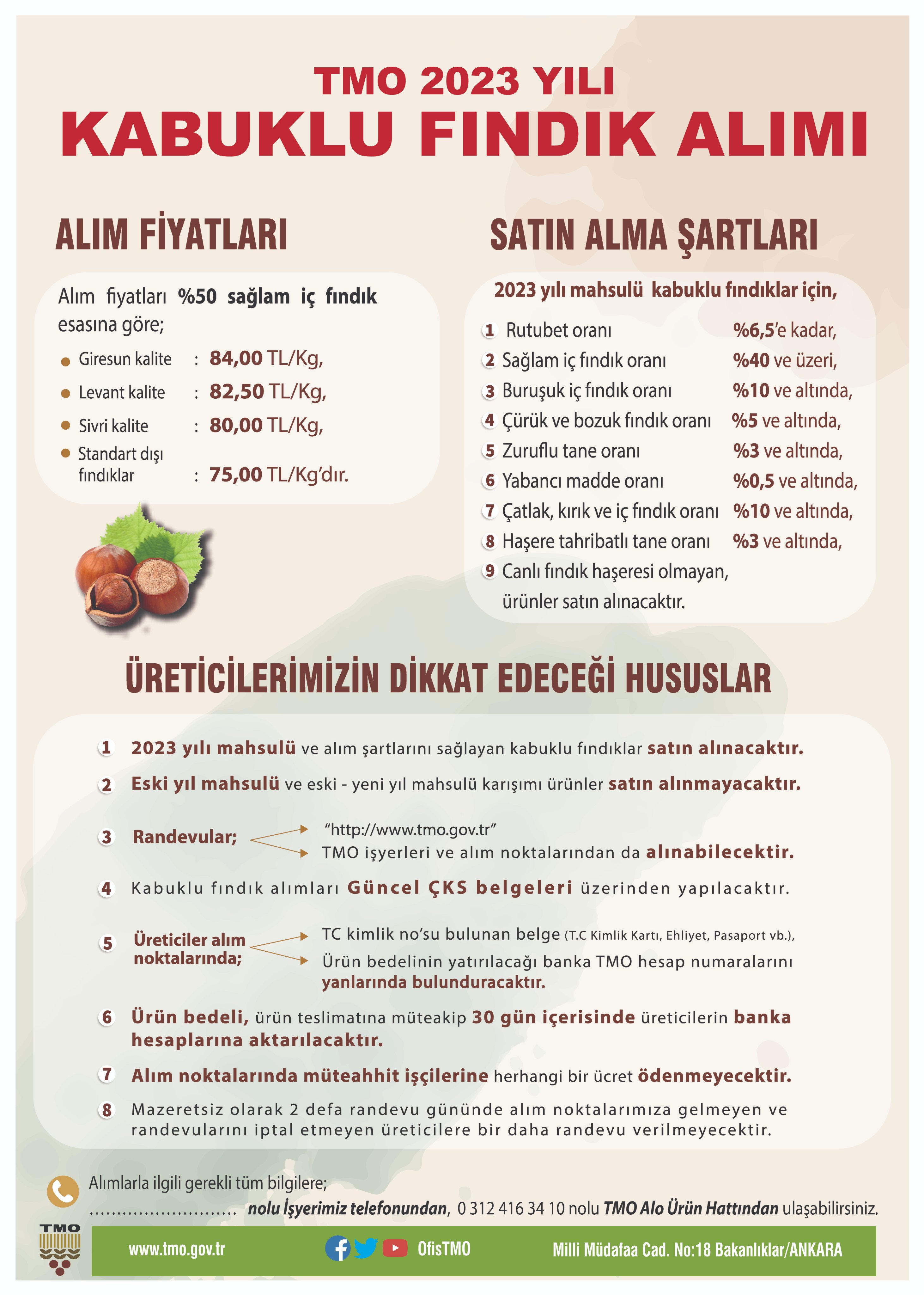 Ürün bedelinin, ürün teslimatına müteakip 30 gün içerisinde üreticilerin banka hesaplarına aktarılacağını belirten TMO, üreticiler randevularını http://randevu.tmo.gov.tr adresinden veya TMO işyerlerine müracaat ederek alınabileceğini, alımlar sırasında üretici memnuniyetini sağlamak ve aksaklık yaşanmamasını sağlamak için Genel Müdürlükte kurulan "Alo Ürün Hattı'ndan 0 312 416 34 10 (8 Hat)'' fındık alımları konusunda bilgi alınabileceğini belirtti.
