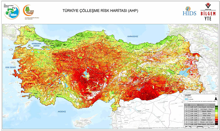 Hazırlanan haritaya göre, Türkiye’nin yaklaşık yüzde 47‘si orta ve üzeri yüksek risk grubuna giriyor. Konya-Karapınar, Iğdır-Aralık, Urfa-Ceylanpınar çölleşmiş durumda iken Tuz Gölü havzası, Ereğli-Karaman bölgesi, Urfa-Ceylanpınar-Mardin-Batman hattı, Eskişehir çevresi ise orta ve yüksek risk grubunu oluşturuyor.