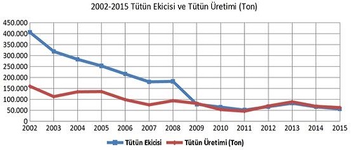 Buna paralel olarak da tütün üretimi 2002 yılında 159 bin 521 ton iken yüzde 61,1 azalarak 2015 yılında yaklaşık 62 bin ton civarına gerilemiş.