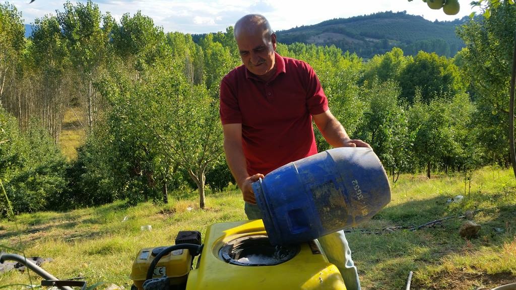 Çanakkale'nin Çan ilçesine bağlı Etili köyünde deveci armutu yetiştiriciliği yapan bir çiftçi, hasadı yaklaşan mahsullerine zarar veren böcekleri bahçesinden uzaklaştırmak için ağaçları tütün suyu ile ıslatarak koruyor.